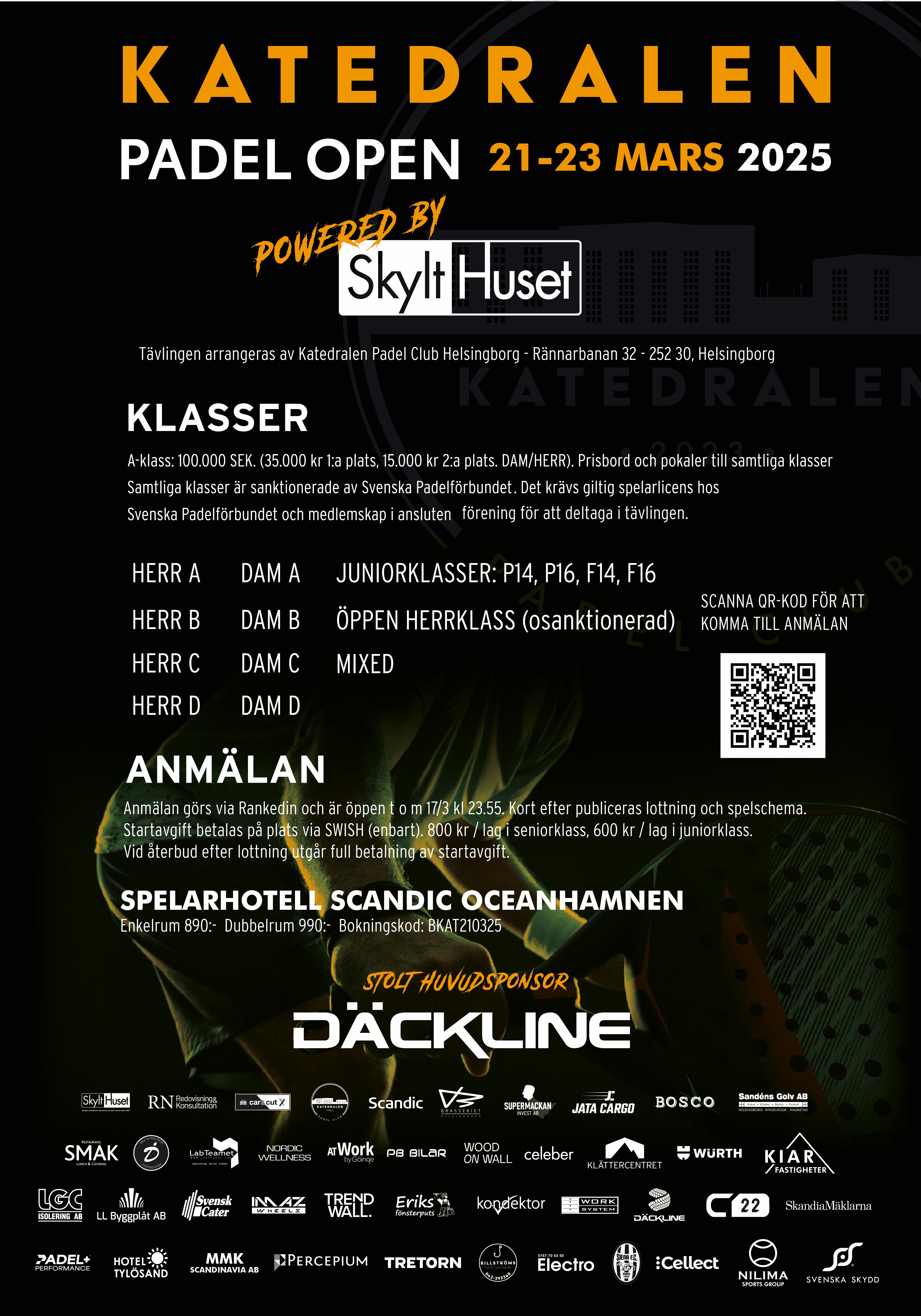 Föreningen arrangerar varje år flera sanktionerade tävlingar. I mars brukar vi arrangera en av Sveriges största padeltävlingar för både elit och bredd - Katedralen Open! Då har ni chansen att se både svenska och utländska proffsspelare live samt delta själva.